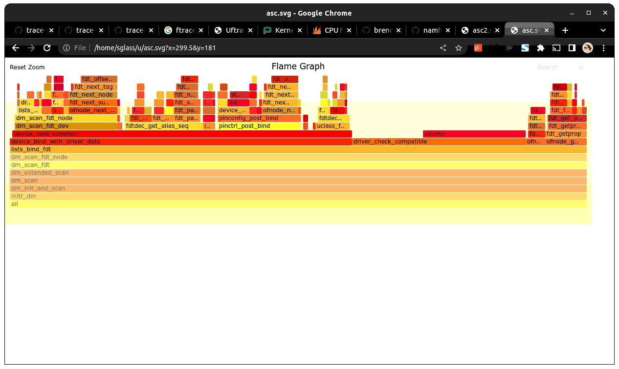 U-Boot supports a simple tracing feature which allows a record of execution to be collected and sent to a host machine for analysis. At present the main use for this is to profile boot time.