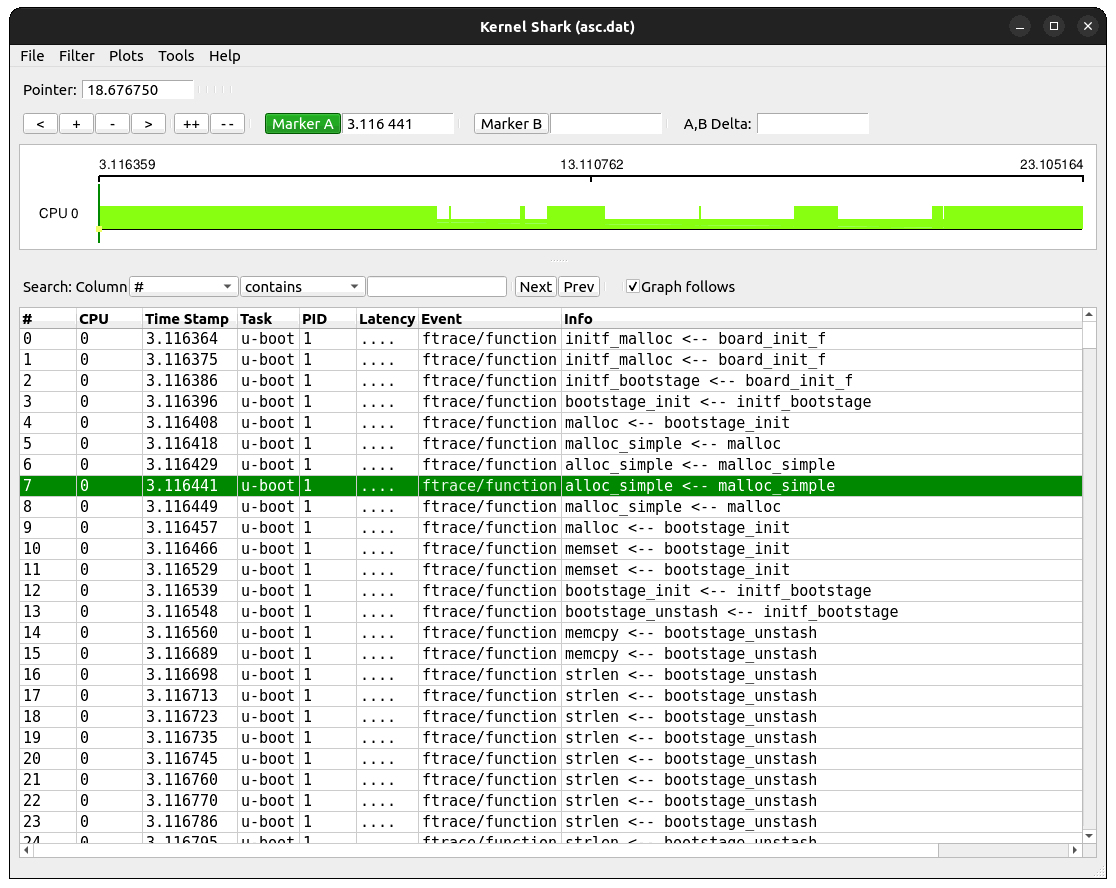 u-boot-1 [000] 3.116429: funcgraph_entry: 0.012 us | alloc_simple();