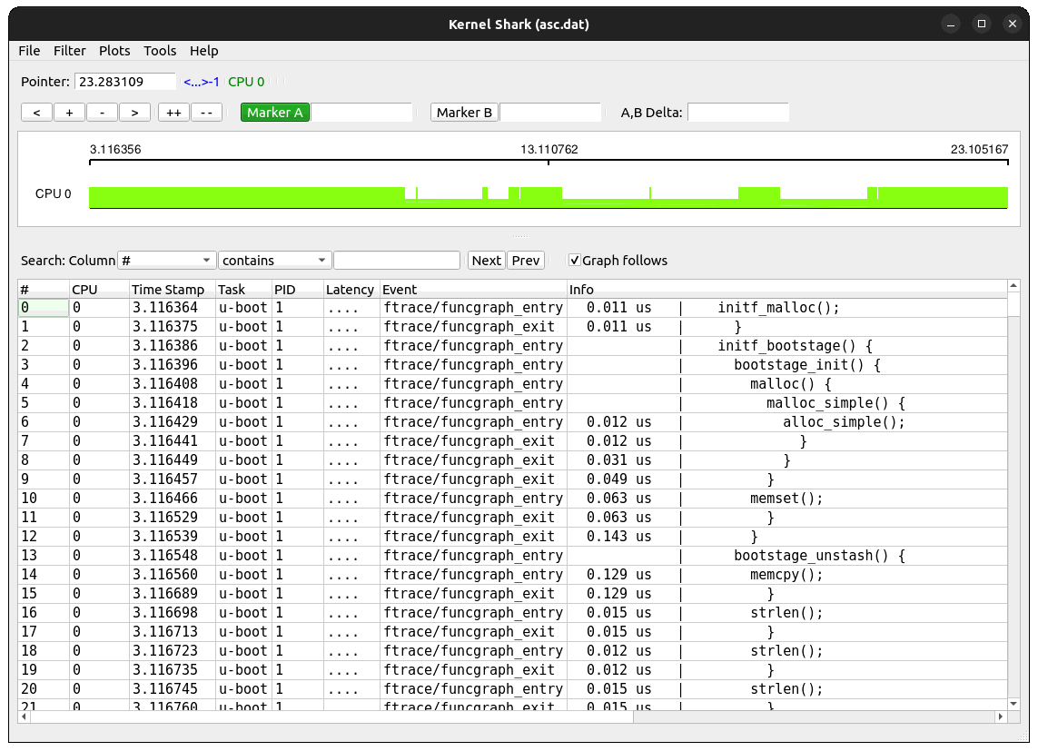 u-boot-1 [000] 3.116364: funcgraph_entry: 0.011 us | initf_malloc();